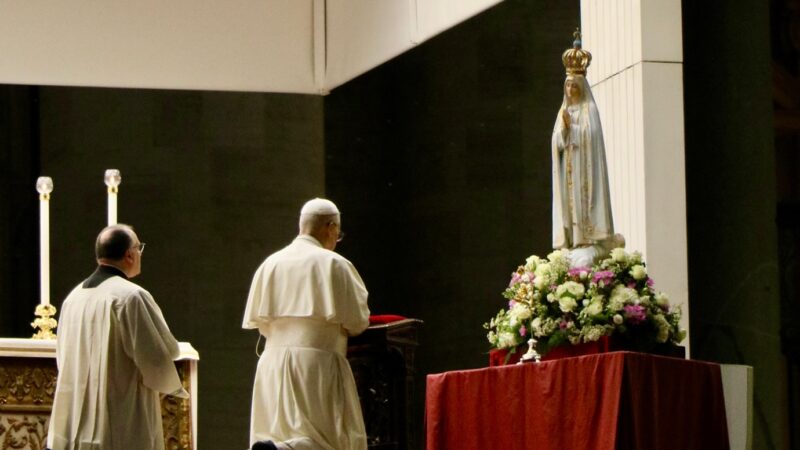 Paus Leo XIV mediteerde over deze thema’s tijdens het bidden van de rozenkrans voor de vrede dat hij zaterdagavond 11 oktober leidde op het Sint-Pietersplein. Het originele beeld van Onze-Lieve-Vrouw van Fatima, dat ter gelegenheid van het Jubeljaar van de Mariale Spiritualiteit naar Rome was gebracht, waakte over de paus en de gelovigen die in gebed waren verenigd.