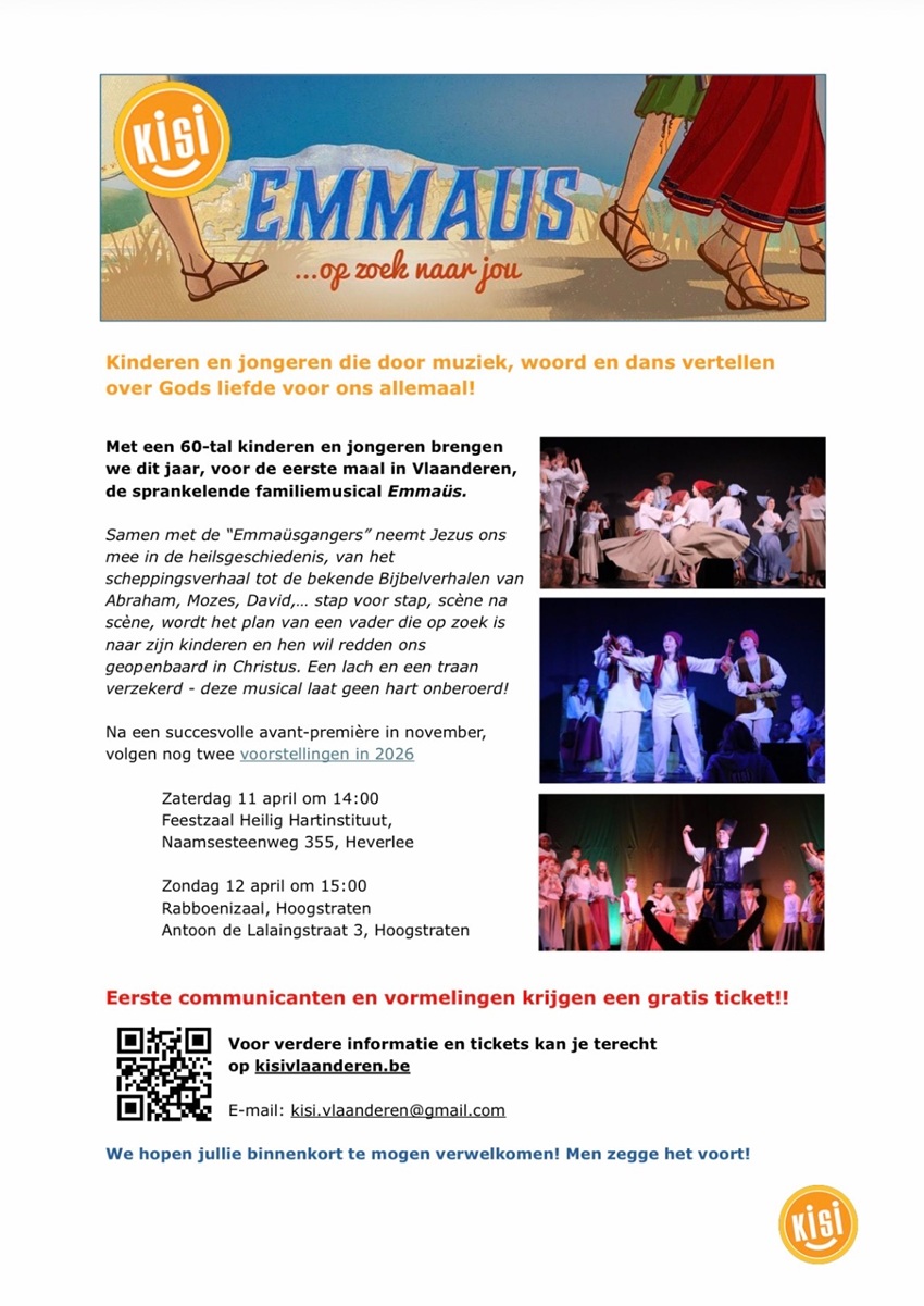 Met een 60-tal kinderen en jongeren brengt Kisi dit jaar, voor de eerste maal in Vlaanderen, de sprankelende familiemusical Emmaüs. Samen met de “Emmaüsgangers” neemt Jezus ons mee in de heilsgeschiedenis, van het scheppingsverhaal tot de bekende Bijbelverhalen van Abraham, Mozes, David,… stap voor stap, scène na scène, wordt het plan van een vader die op zoek is naar zijn kinderen en hen wil redden ons geopenbaard in Christus. Een lach en een traan verzekerd – deze musical laat geen hart onberoerd!